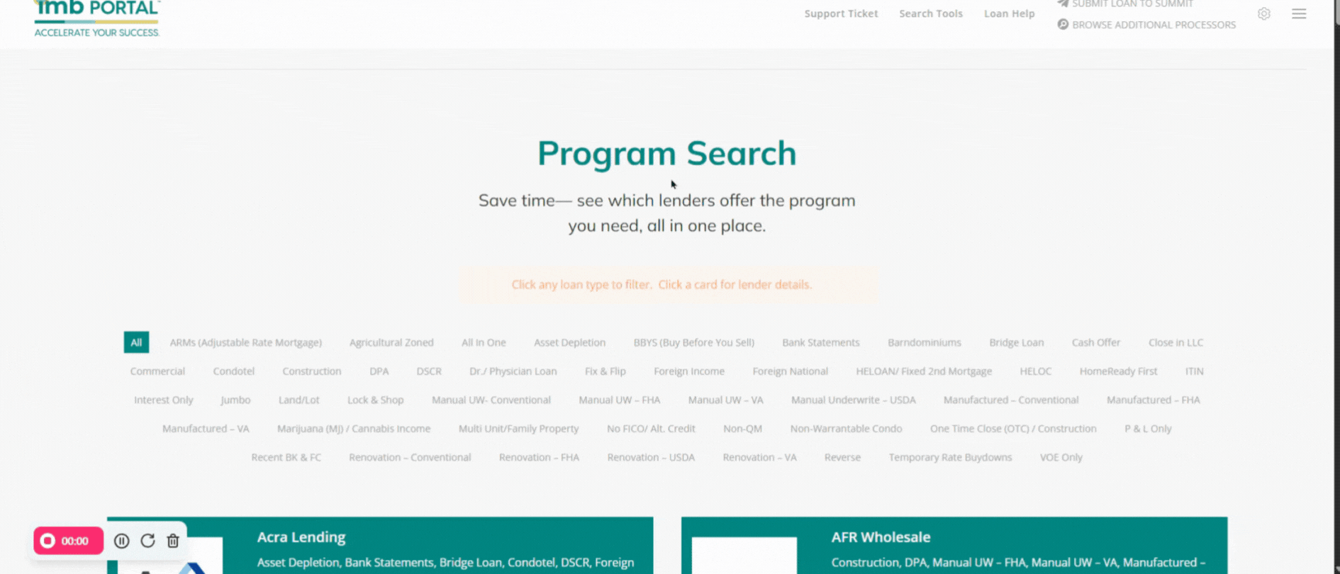 IMB™ ensures that brokers have access to an extensive array of products from various lenders. This not only increases your ability to serve clients effectively but also sets you apart from the competition in terms of offering better options. Through the IMB™ Portal, brokers can use the built-in Program Search tool to instantly see which lenders offer specific loan programs—saving time and ensuring clients are matched with the right products quickly and accurately.
